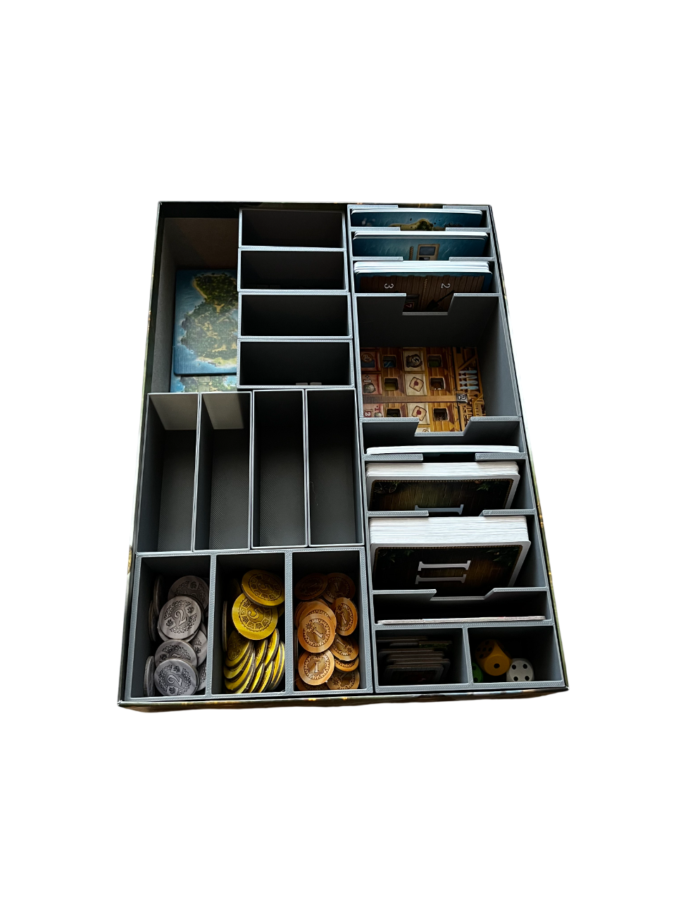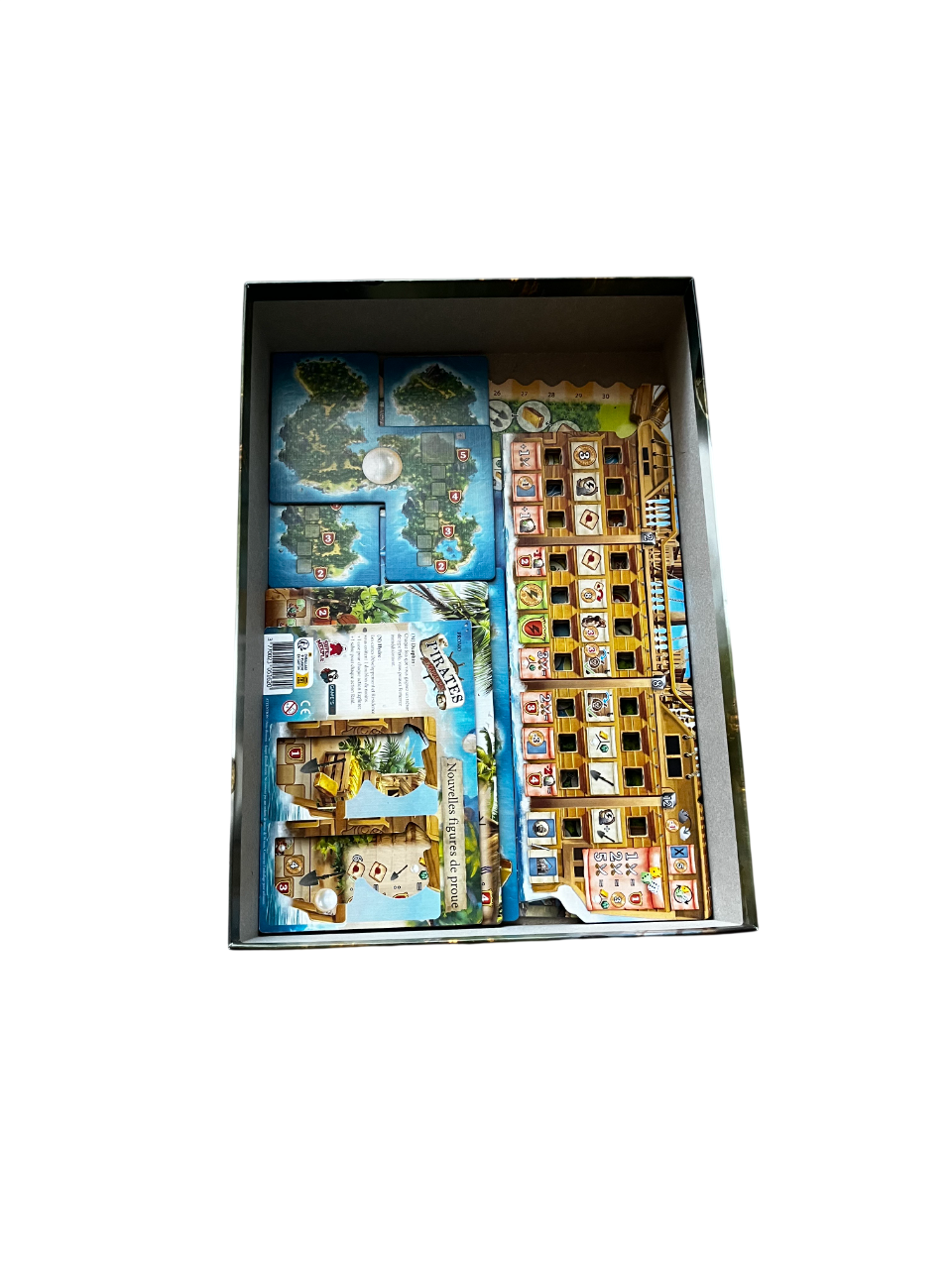 Cet insert en impression 3D adapté pour le jeu « Pirates de maracaïbo » se glisse dans la boite de base.